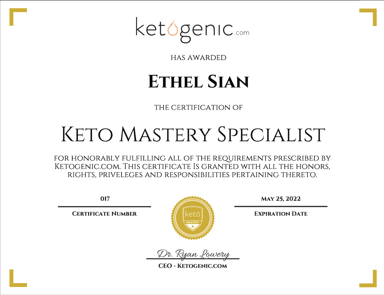 I received my Keto Mastery Specialist (K.M.S) Certification on May 25, 2020.